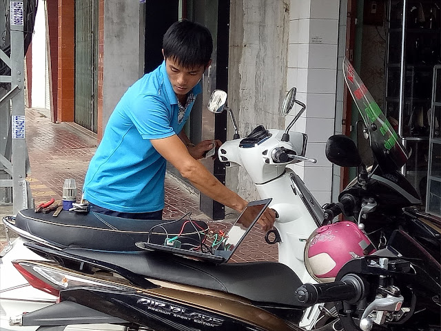 +Các thao tác của thợ khóa: chúng tôi mở khóa và dũa 2 chìa khóa chưa có chip, bật chương trình giải mã từ (operating piaggio unlock systems), kết nối hệ thông máy tính với xe (connect device to vehicle). Cuối cùng khách hàng tự đọc mã và tự chép từ theo hướng dẫn của thợ khóa.